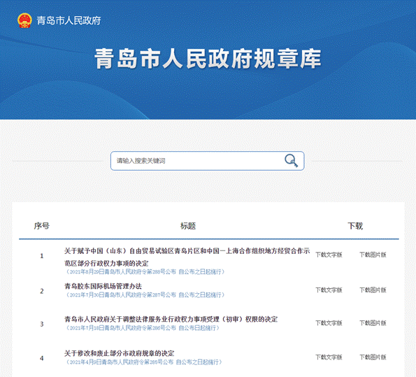 組織各部門梳理信息公開目錄,使目錄設(shè)置更加科學(xué)合理、規(guī)范有序。根據(jù)國家、省關(guān)于規(guī)章集中公開工作的要求,在青島政務(wù)網(wǎng)開發(fā)建設(shè)了規(guī)章庫,集中統(tǒng)一規(guī)范公開了現(xiàn)行有效的政府規(guī)章,并提供了文字版和圖片版的下載鏈接。