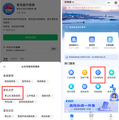 方式一:參保人關(guān)注“青島醫(yī)療保障”微信公眾號(hào),在公眾號(hào) 頁(yè)面下方點(diǎn)擊“掌辦大廳-掌上辦.我的醫(yī)保”,登錄后,依次點(diǎn)擊“門(mén)診慢特病→基本醫(yī)療保險(xiǎn)參保人員享受門(mén)診慢特病病種待遇認(rèn)定→填寫(xiě)申辦信息→在線提交申辦材料”,等待審核。
