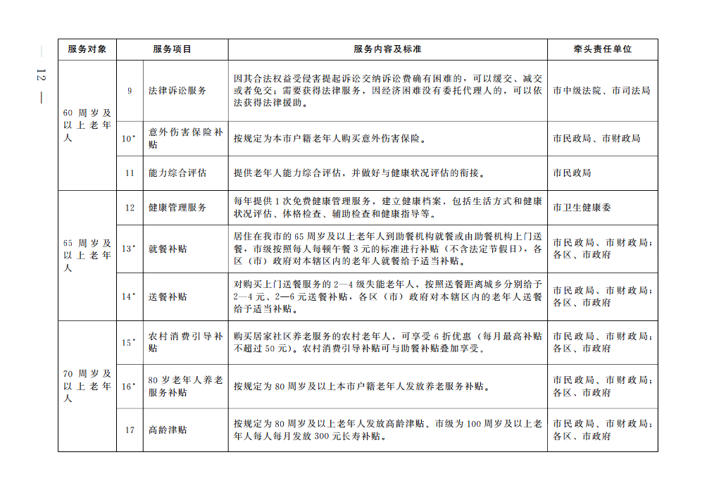 5.落實(shí)老年人優(yōu)待制度。按規(guī)定落實(shí)老年人免費(fèi)乘坐城市公共交通工具、免費(fèi)進(jìn)入公共文化設(shè)施、按照時(shí)段免費(fèi)或半價(jià)使用政府興辦或支持的公共體育設(shè)施,落實(shí)就醫(yī)便利服務(wù)、法律訴訟服務(wù)等優(yōu)待制度,完善老年人意外傷害保障制度。(市民政局牽頭,市司法局、市財(cái)政局、市交通運(yùn)輸局、市文化和旅游局、市衛(wèi)生健康委、市體育局、市中級(jí)人民法院按職責(zé)分工負(fù)責(zé))
