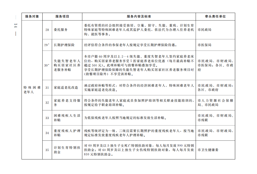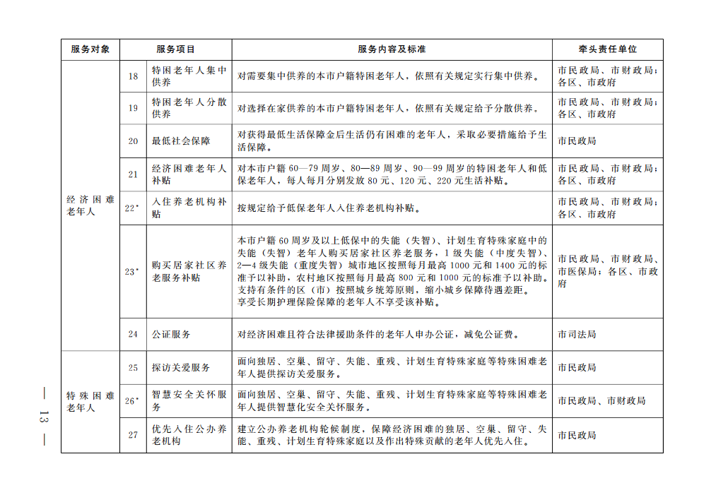 1.健全基本養(yǎng)老服務(wù)清單制度。發(fā)布基本養(yǎng)老服務(wù)清單,明確具體服務(wù)對象、項(xiàng)目、內(nèi)容、標(biāo)準(zhǔn)等。各區(qū)(市)清單覆蓋范圍和實(shí)現(xiàn)程度不低于市級(jí)清單要求,并根據(jù)經(jīng)濟(jì)社會(huì)發(fā)展水平、財(cái)力狀況、老年人需求等因素動(dòng)態(tài)調(diào)整。建立基本養(yǎng)老服務(wù)項(xiàng)目統(tǒng)計(jì)調(diào)查和發(fā)布制度。(市民政局牽頭,各區(qū)、市政府負(fù)責(zé)落實(shí)。以下各項(xiàng)工作均需各區(qū)、市政府負(fù)責(zé)落實(shí),不再一一列出。)