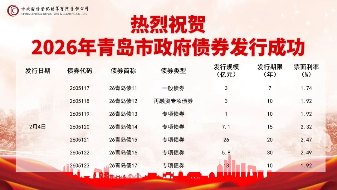我市于2月4日下午在中央結(jié)算公司發(fā)行2026年第三批地方政府債券58.9億元,其中新增一般債券3億元,發(fā)行期限7年期,中標(biāo)利率 1.74%;新增專項(xiàng)債券52.9億元,發(fā)行期限為10年期、15年期、20年期、30年期,中標(biāo)利率分別為1.92%、2.32%、2.47%、2.49%;再融資專項(xiàng)債券3億元,發(fā)行期限為10年期,中標(biāo)利率為1.92%。全場投標(biāo)總量963億元,投標(biāo)倍數(shù)16.35倍,反映出金融市場對我市經(jīng)濟(jì)社會發(fā)展充滿信心。本批新增債券資金將用于我市山東大學(xué)齊魯醫(yī)院一期提升改造、老舊小區(qū)改造項(xiàng)目等工程項(xiàng)目,助力提升我市公共基礎(chǔ)設(shè)施保障水平。