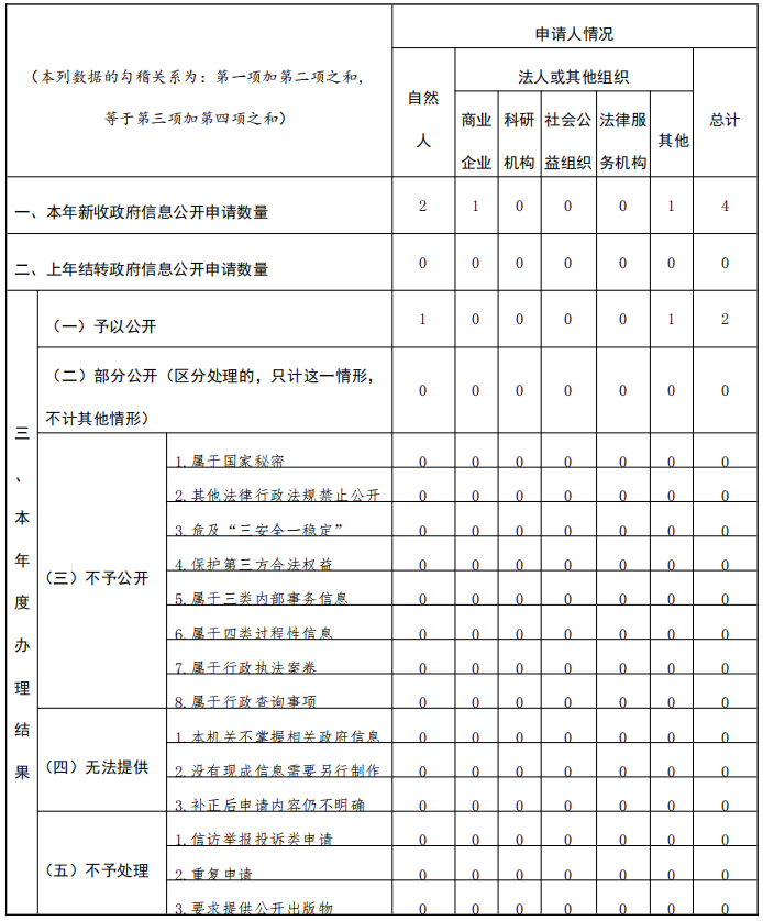 暢通政府信息依申請(qǐng)公開(kāi)渠道,持續(xù)提升依申請(qǐng)公開(kāi)辦理的程序化、規(guī)范化、標(biāo)準(zhǔn)化水平。2024年,網(wǎng)上受理依申請(qǐng)公開(kāi)4件,2件已按照規(guī)定時(shí)限和流程予以答復(fù),做到答復(fù)及時(shí)準(zhǔn)確規(guī)范。本年度無(wú)因政府信息公開(kāi)申請(qǐng)?zhí)崞鹦姓?fù)議、行政訴訟情況。