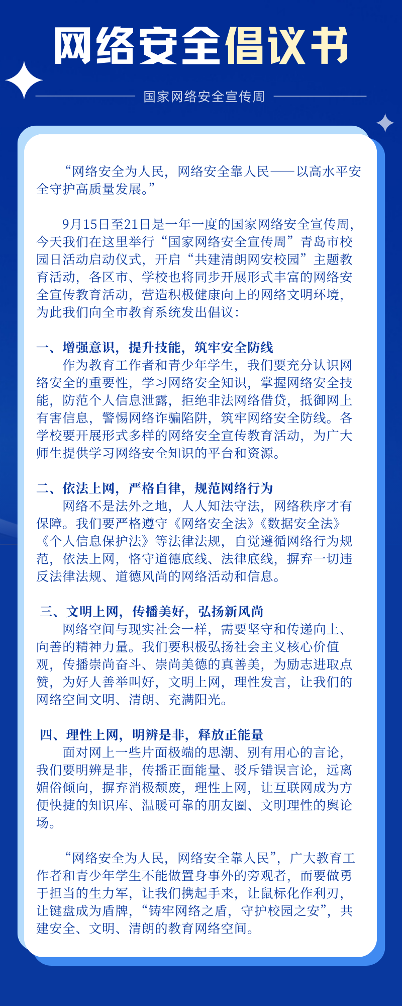 活動(dòng)期間,市教育局還發(fā)出了《網(wǎng)絡(luò)安全倡議》,號(hào)召全市各級(jí)各類學(xué)校積極開展“六個(gè)一”系列活動(dòng):觀看一堂反詐網(wǎng)絡(luò)大課,組織一場網(wǎng)絡(luò)安全專題活動(dòng),開展一次網(wǎng)絡(luò)安全知識(shí)宣講,進(jìn)行一次網(wǎng)絡(luò)安全風(fēng)險(xiǎn)排查,創(chuàng)作一批網(wǎng)絡(luò)安全創(chuàng)意作品,形成一批網(wǎng)絡(luò)安全數(shù)字資源,以更接地氣、更靈活的方式,開展形式多樣、貼近師生生活的網(wǎng)絡(luò)安全宣傳教育活動(dòng),吸引廣大師生積極參與、學(xué)有所獲。