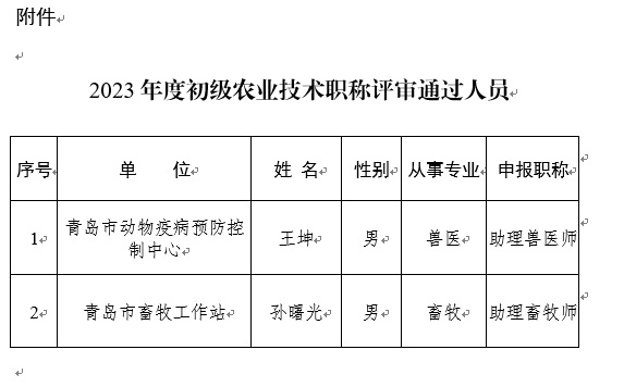 根據(jù)《山東省職稱評(píng)審管理服務(wù)實(shí)施辦法》(魯人社規(guī)〔2021〕1號(hào))及有關(guān)規(guī)定,經(jīng)審核,青島市農(nóng)業(yè)農(nóng)村局農(nóng)業(yè)技術(shù)職務(wù)初級(jí)評(píng)審委員會(huì)于2024年2月28日評(píng)審?fù)ㄟ^(guò)的王坤助理獸醫(yī)師資格、孫曙光助理畜牧師資格,符合國(guó)家規(guī)定的評(píng)審條件和評(píng)審程序,現(xiàn)予以公布。