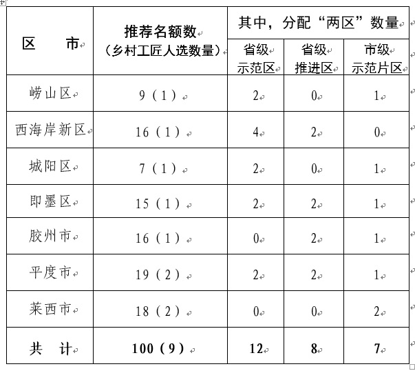 各區(qū)市(含漁業(yè))共推薦100名(含9名鄉(xiāng)村工匠),其中6個鄉(xiāng)村振興齊魯樣板省級示范區(qū)和4個省級銜接鄉(xiāng)村振興集中推進(jìn)區(qū),每個原則上分配推薦名額2個;7個青島市鄉(xiāng)村振興示范片區(qū),每個原則上分配推薦名額1個。各區(qū)市按照分配名額進(jìn)行推薦(見附件1)。