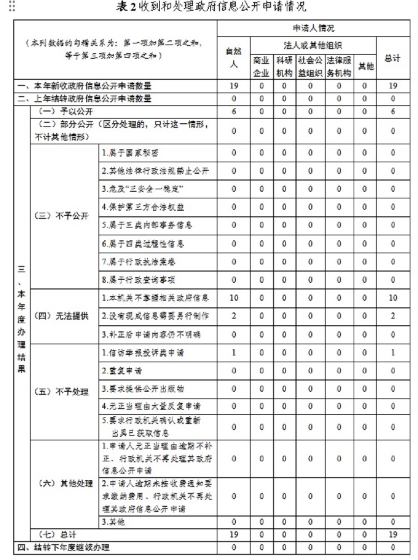 收到和處理政府信息公開申請19件,均為自然人申請,按期答復19件,其中予以公開6件,不予公開0件,無法提供12件,不予處理1件。