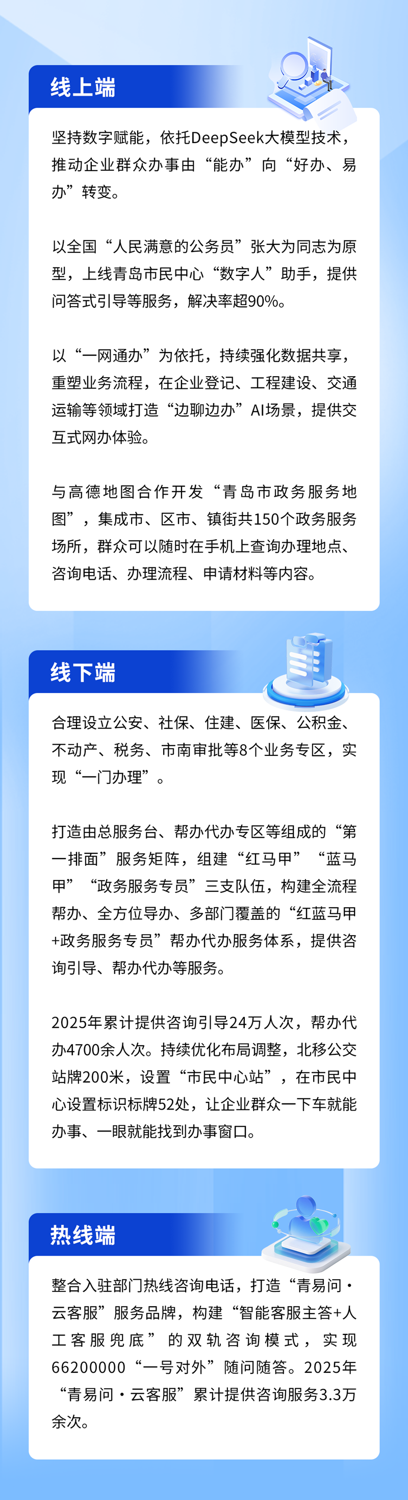 三、DeepSeek版智能客服數(shù)智賦能、秒懂需求。我局積極探索人工智能技術(shù)在政務(wù)服務(wù)領(lǐng)域的深度應(yīng)用,基于DeepSeek大模型對(duì)“青易問(wèn)·云客服”進(jìn)行全新升級(jí),將傳統(tǒng)“線下窗口咨詢、線上電話咨詢”升級(jí)為“AI客服主答+人工專員兜底”的咨詢服務(wù)新模式,對(duì)辦事過(guò)程中的政策依據(jù)、辦事流程、材料清單、申報(bào)要點(diǎn)等高頻問(wèn)題,實(shí)現(xiàn)“秒問(wèn)秒答”。升級(jí)后的“青易問(wèn)·云客服”主要在以下三方面取得明顯突破:一是及時(shí)響應(yīng),答得更快。與傳統(tǒng)人工客服相比,智能客服平均響應(yīng)時(shí)長(zhǎng)由59秒縮短至3秒,響應(yīng)速度提升近90%,實(shí)現(xiàn)"秒懂訴求"。二是深度分析,理解更準(zhǔn)。基于大模型的自然語(yǔ)言深度理解能力,智能客服能更準(zhǔn)確解析群眾口語(yǔ)化、非標(biāo)準(zhǔn)的表達(dá)意圖,從而進(jìn)行更為針對(duì)性的流暢解答。三是精準(zhǔn)輸出,答得更好。新升級(jí)的知識(shí)庫(kù)系統(tǒng)具備對(duì)于政策文件的積累、分析與總結(jié)能力,突破傳統(tǒng)問(wèn)答“一對(duì)一”匹配的限制,可以綜合分析提供針對(duì)性更強(qiáng)的解答。目前收集錄入知識(shí)庫(kù)8000余條,涉及企業(yè)開辦、工程建設(shè)、民非社團(tuán)等重點(diǎn)業(yè)務(wù)領(lǐng)域知識(shí),以及市民中心交通位置、樓層布局、可辦事項(xiàng)、便民服務(wù)等綜合服務(wù)類知識(shí),解答范圍涵蓋1000余項(xiàng)政務(wù)服務(wù)事項(xiàng)。