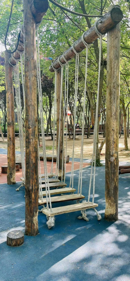 新增的攀爬架是座“反卷訓練營”,拒絕電子屏幕的“頸椎刺客”,只批發(fā)最原始的快樂:當孩子像樹懶抱住樹干般吊在繩索上時,他們肌肉里覺醒的,是遠古人類幼崽該有的山林記憶。 ?